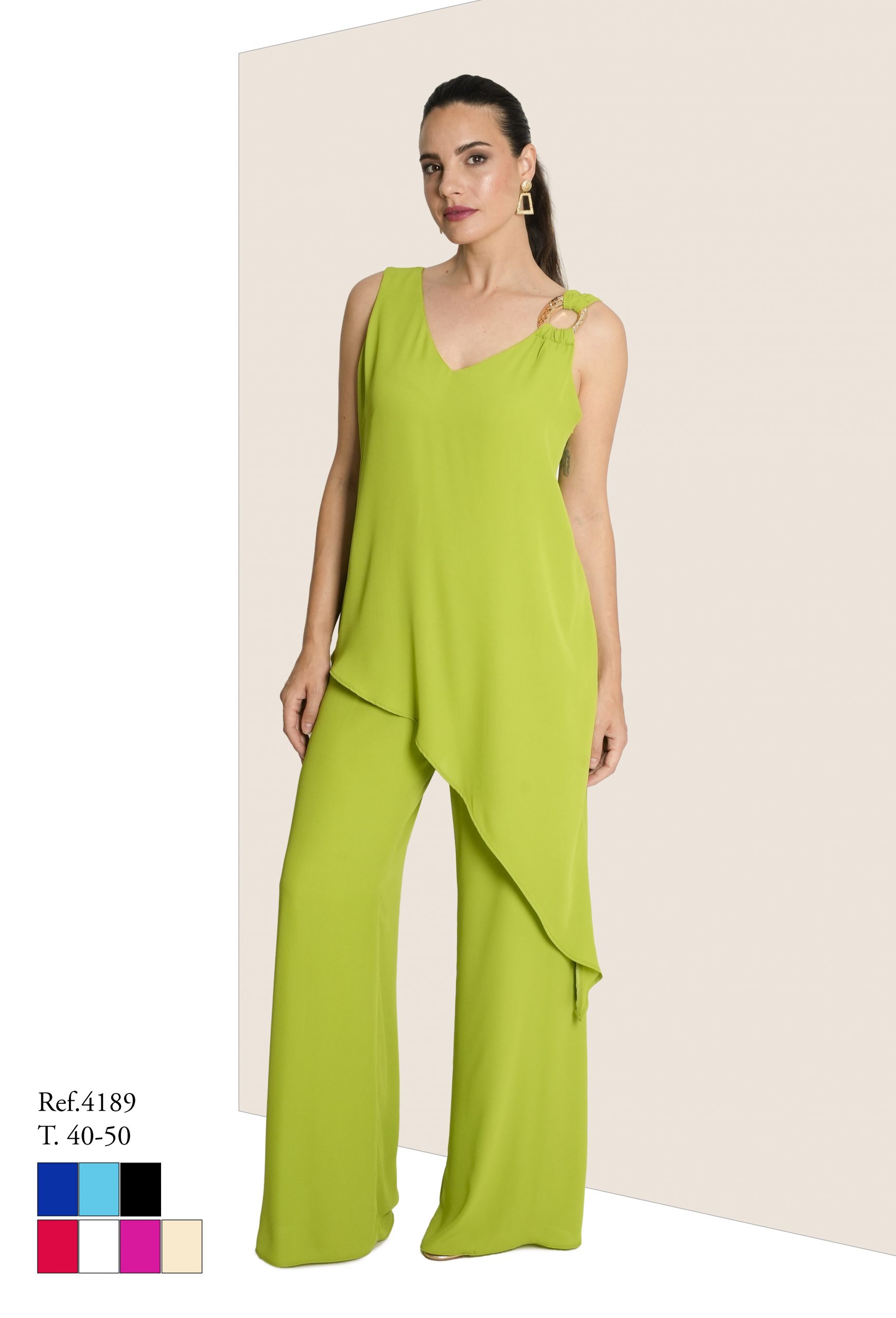 Conjunto de blusa larga en manga sisa con adorno de anilla metálica en dorado.