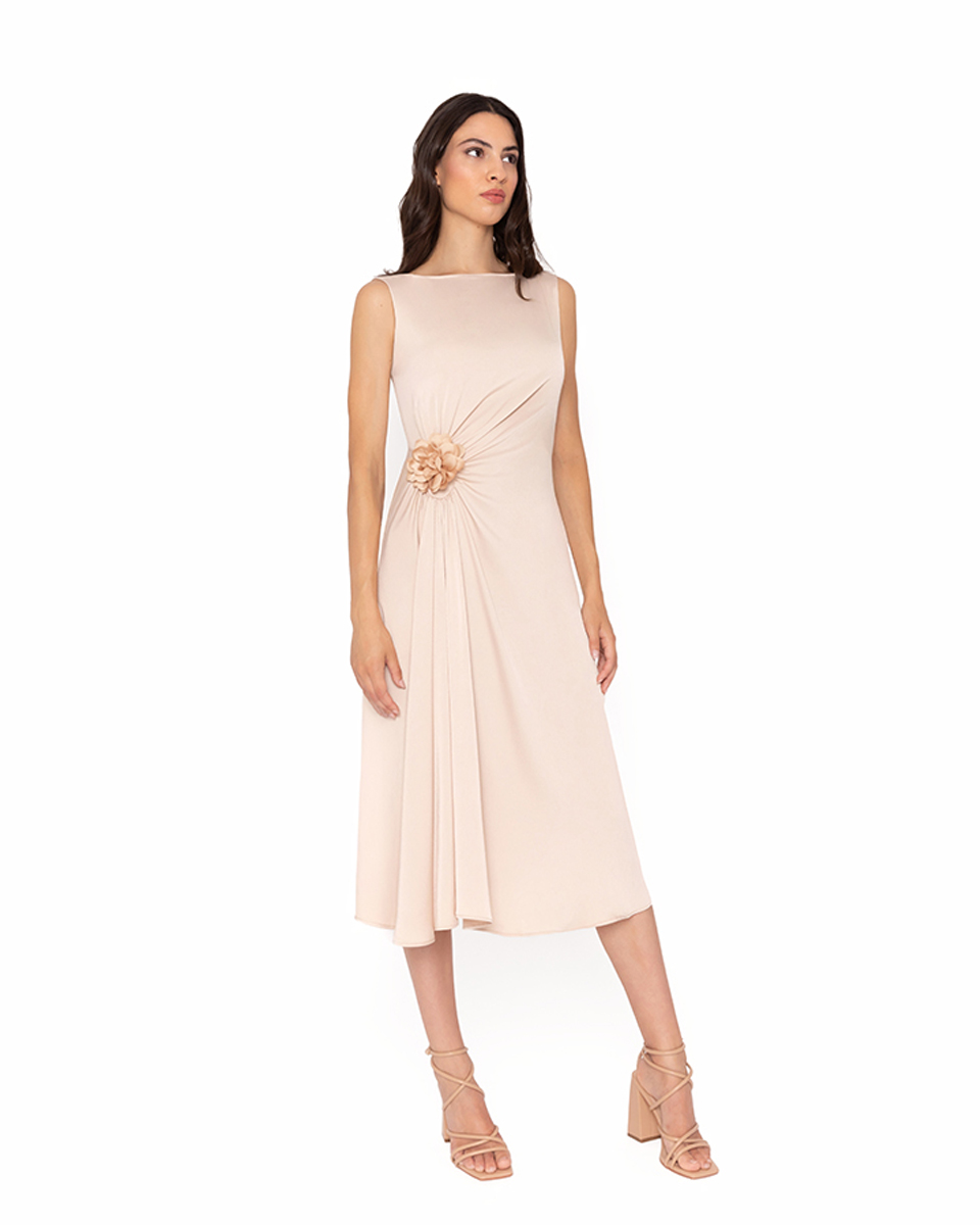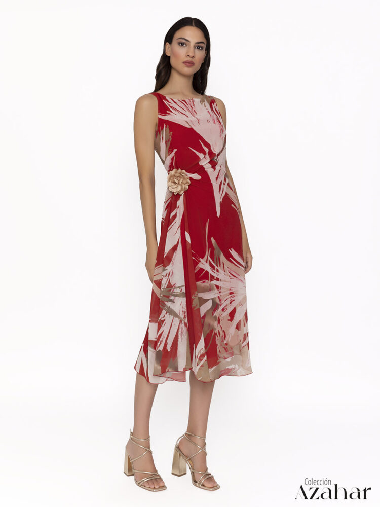 Vestido de gasa en manga sisa. Corte un poco suelto en cadera. Flor a juego desmontable. Disponible en estampado.