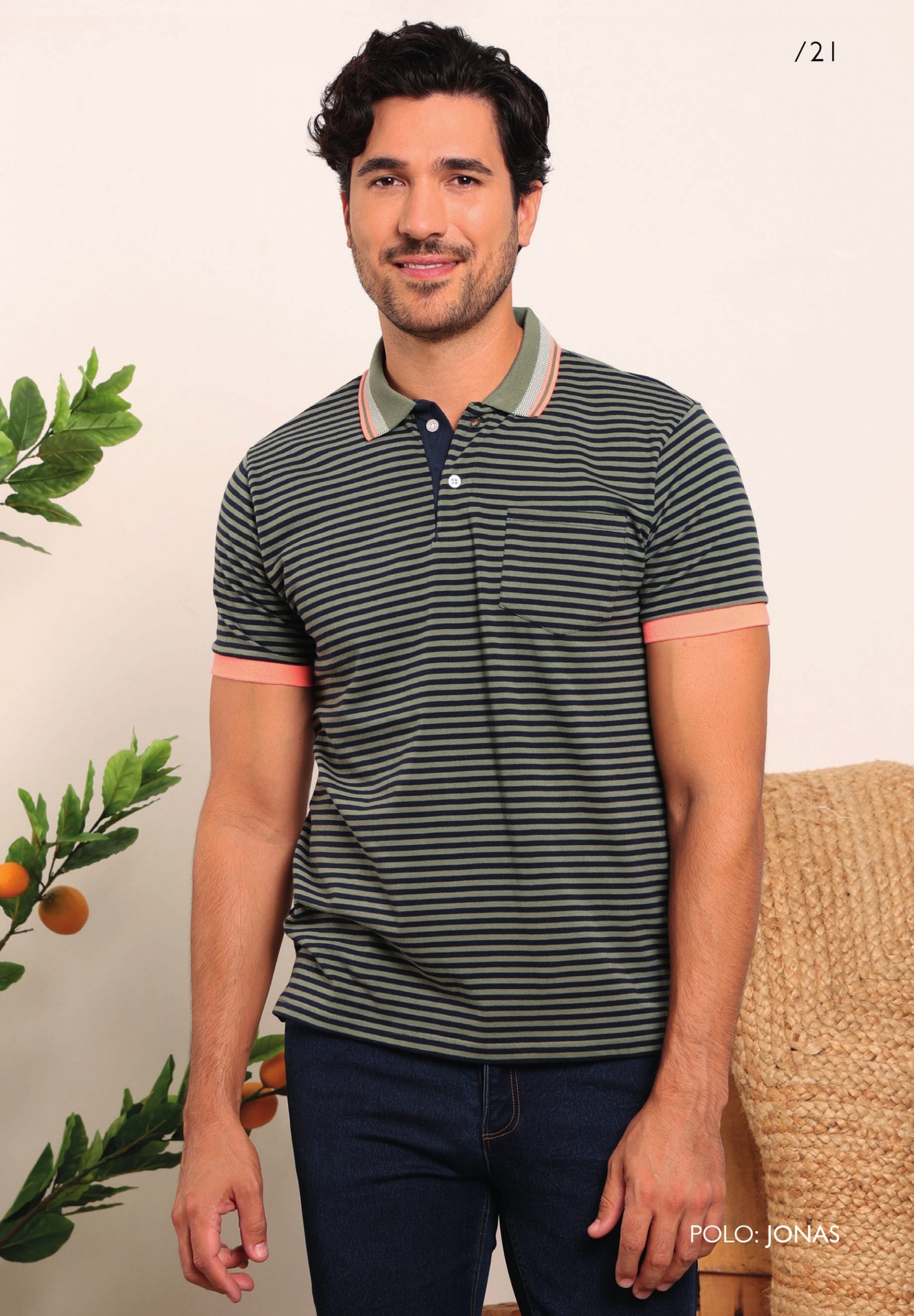 Rayas en azul marino y verde kaki y filo de cuello y manga en naranja.